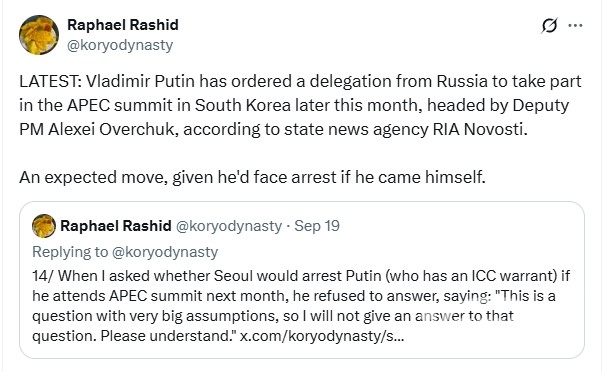 하지만, 푸틴 러시아 대통령은 우크라이나 어린이 강제 이주 혐의로 국제형사재판소(ICC) 체포영장이 발부돼 외국 방문을 좀처럼 하지 않고 있다. 한국은 ICC 회원국이어서 푸틴 대통령이 입국하면 영장 집행에 협조하지 않으면 안 되는 상황이다.