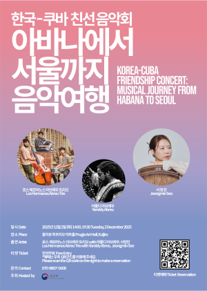 한국과 쿠바가 수교 25주년을 맞아 두 나라의 음악적 정서를 교류하는 기념 공연이 열린다. 외교부가 주관하는 한-쿠바 수교 기념 음악회 ‘아바나에서 서울까지 음악여행’이 오는 12월 2일 서울 푸르지오 아트홀에서 오후 2시와 7시 30분, 두 차례에 걸쳐 진행된다.