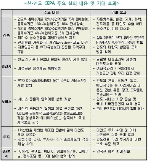 한-인도 CEPA가 발효되면, 인도는 우리의 수출품목 중 85%(품목 및 수입액 기준)에 대해 관세를 철폐하거나 인하하게 된다. 이는 자동차 부품, 철강, 기계, 화학, 전자제품 등 우리나라의 대인도 10대 수출품을 모두 포함하는 것이다. 또한 개성공단에서 생산되는 108개 품목도 한국산으로 인정받아 특혜를 누리게 된다.