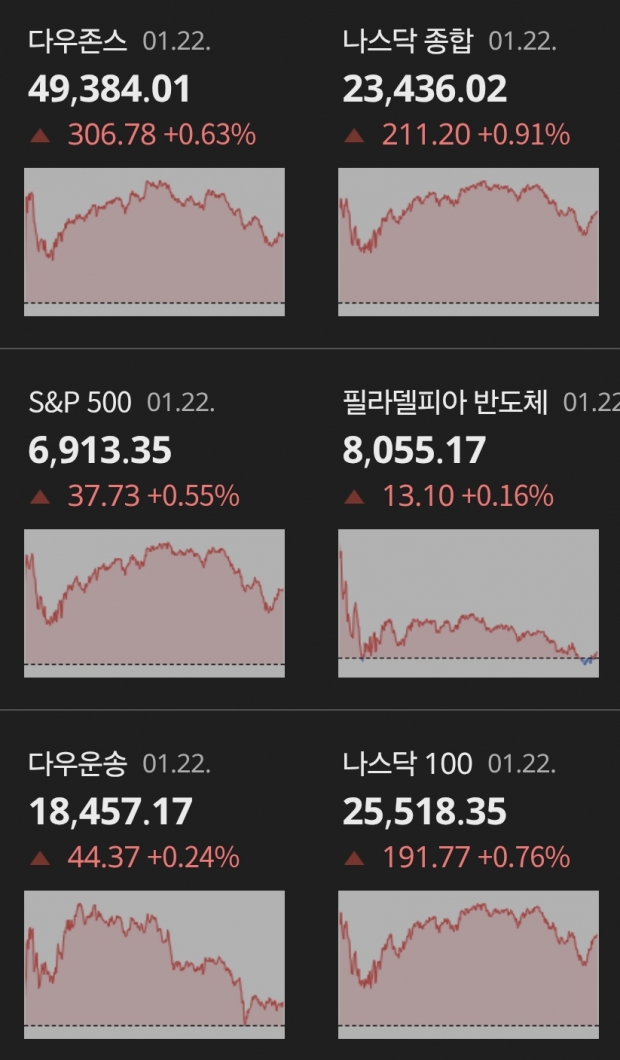 22일(현지시간) 뉴욕증시가 미국 주요 경제지표의 긍정적 흐름과 빅테크 주가의 강세에 힘입어 상승 마감했다. 이날 다우존스, S&P500, 나스닥 등 3대 지수가 모두 오르며 마감한 가운데, 중소형주 중심의 러셀2000지수는 사상 최고치를 새로 썼다. 그린란드를 둘러싼 긴장 완화와 함께 순조로운 경제지표가 투자심리를 지지한 것으로 분석된다.