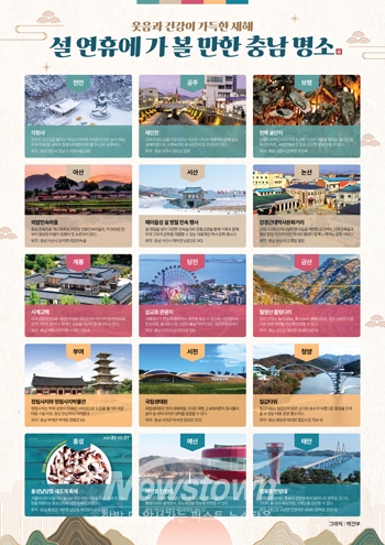 한편 도는 충남을 찾는 방문객의 편의를 위해 설 연휴 기간 개최되는 주요 행사·프로그램 및 관광지·맛집·숙소 운영 현황을 충남관광 누리집을 통해 알리고 있다. 아울러 충남 방문의 해를 맞아 한국도로공사 충청권 고속도로 휴게소 이용객을 대상으로 도내 제휴 관광지 31개소 입장료 할인 등의 혜택도 제공하고 있다.