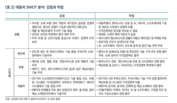 보고서는 ·중 첨단 제조업 경쟁이 구조적으로 심화되는 가운데, 기존의 협력 방식 모델은 점차 한계에 직면해 있다고 지적하고, “·중 산업 경합성은 이제 첨단 제조분야로 전환되었으며, 일부 분야에서는 규모, 속도, 정부 지원 측면에서 한국이 직접적으로 경쟁하기 어려운 단계에 진입했다고 진단했다.