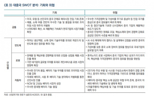 보고서는 양국의 경합성 확대로 우리 산업의 위협요인이 존재하나, 선진·틈새 시장 등에서 차별화 기회 모색할 필요가 있으며, 중국의 가격경쟁력 우위와 AI 기반 신시장에서의 글로벌 시장지배력 확대, 중국의 공급망 내재화가 우리산업에 공통적인 위협으로 작용하고 있다고 적었다.
