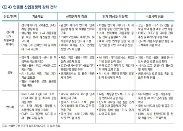 이어 보고서는 기술 주권확보와 첨단 제조 생태계 구축을 위한 독자적 K-제조 모델 마련 긴요하다면서, 중국은 전통산업을 넘어 전기차, 로봇, 반도체 등 핵심 첨단산업에서 국가 주도의 대규모 투자와 생태계 확장을 통해 한국의 제조 입지를 위협하고 있다고 지적했다.