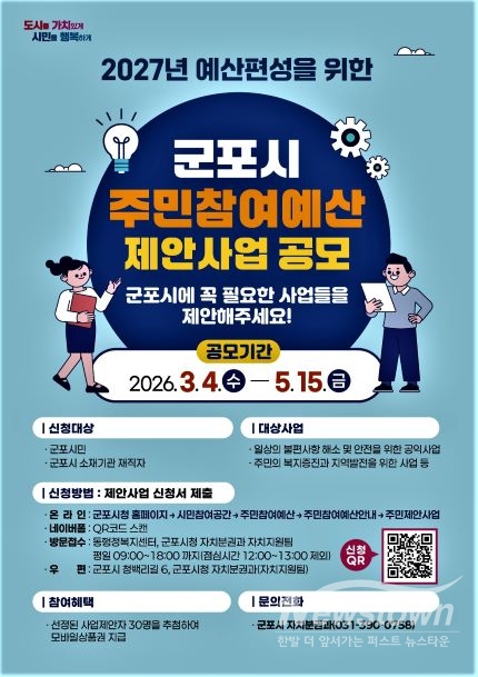 [뉴스타운/송은경 기자] 군포시는 4일부터 5월 15일까지 ‘2027년 예산편성을 위한 주민참여예산 제안사업’을 공모한다.