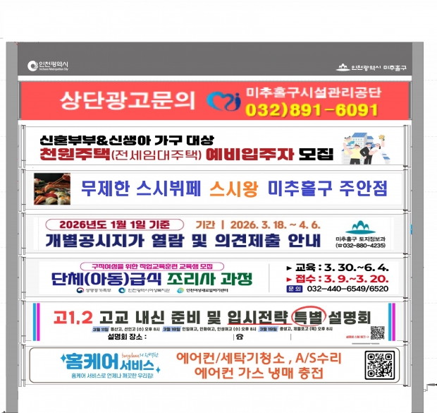 이영훈 미추홀구청장은 “이번 가이드라인 완화를 통해 현수막 게시대의 디자인 자율성을 높이고 광고매체로서의 경쟁력을 강화할 것으로 기대한다”며 “앞으로도 도시 미관과 홍보 효과가 조화를 이루는 게시대 운영을 위해 노력하겠다”고 말했다.