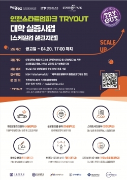 인천경제자유구역청이 스타트업의 기술 검증과 사업화 지원을 위한 ‘TRYOUT 대학 실증사업’ 참여기업 모집에 나섰다.
