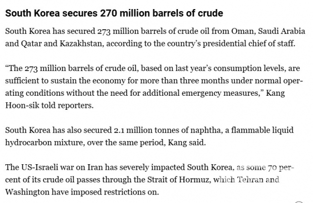 강 실장은 이어 ”이번에 확보한 원유와 나프타는 호르무즈 해협 봉쇄와 무관한 대체 공급선에서 도입될 예정“이며 ”국내 수급 안정화에 직접적이고, 실질적으로 기여할 것으로 생각한다“고 말했다.