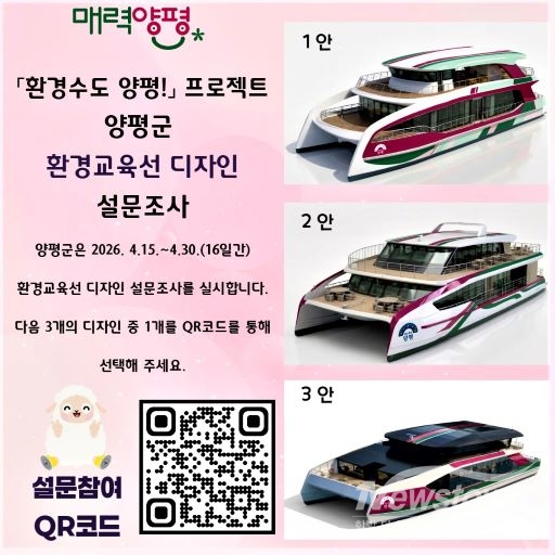 [뉴스타운/김준혁 기자] 양평군이 환경교육선 디자인 선정을 위해 15일부터 30일까지 군민 설문조사를 진행한다. 이번 조사는 ‘환경수도 양평! 프로젝트’의 첫 사업으로 추진되는 환경교육선에 군민 의견을 반영하기 위해 마련됐다.