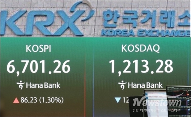 한국거래소(KRX)에 따르면, 28일 오전 10시 7분 기준, 코스피는 전장보다 86.88P(포인트, 1.31%) 오른 6,701.91을 찍었다.